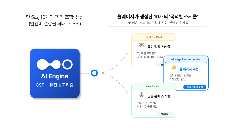 AI, 올웨이지 알고리즘이 분석하여 단, 5초만에 최적의 근무표를 완성합니다.