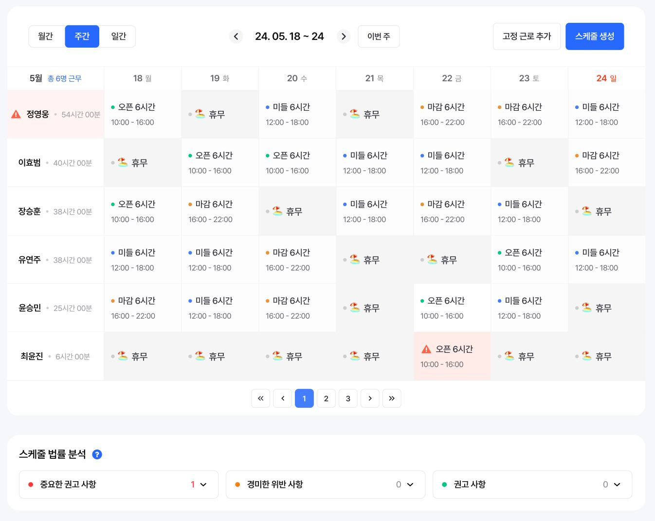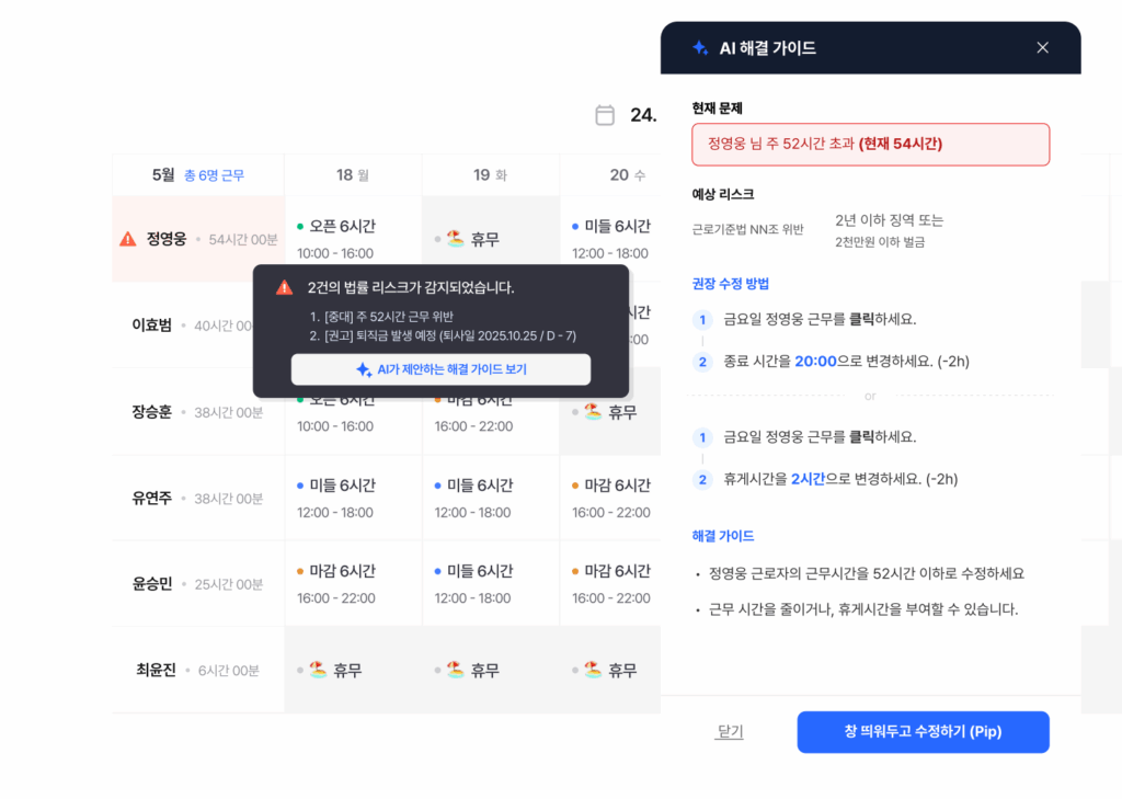 스케줄을 생성 즉시 법 위반 사항을 감지하고, 차단하여 실수를 예방합니다.